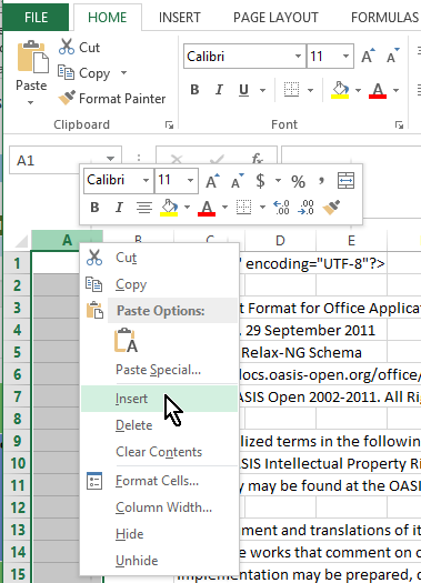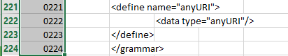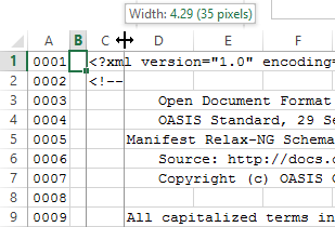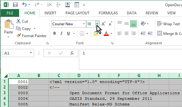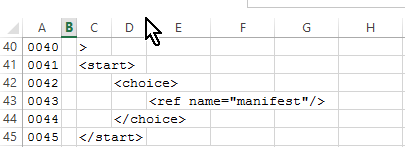 Microsoft Office 2013 Excel is used for conversion of the XML document as text to a plaintext replica with an additional line-numbering column. There is sufficient information to be able to employ alternative tools for this portion of creating replicas of XML documents that are amenable to use in annotations, commentaries, and other custom activities. Use of other text-handling tools can be more straightforward, especially if indentation adjustments (essentially the elimination of tabs) are not required as they are with Excel.