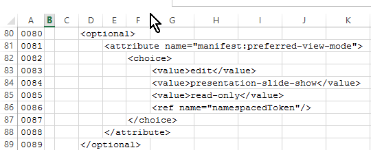 The examples illustrate the creation of annotation forms of the OpenDocument v1.2 Manifest Schema, an XML document although named with a .rng extension. The file that the procedure examples started with is [n140504b3].